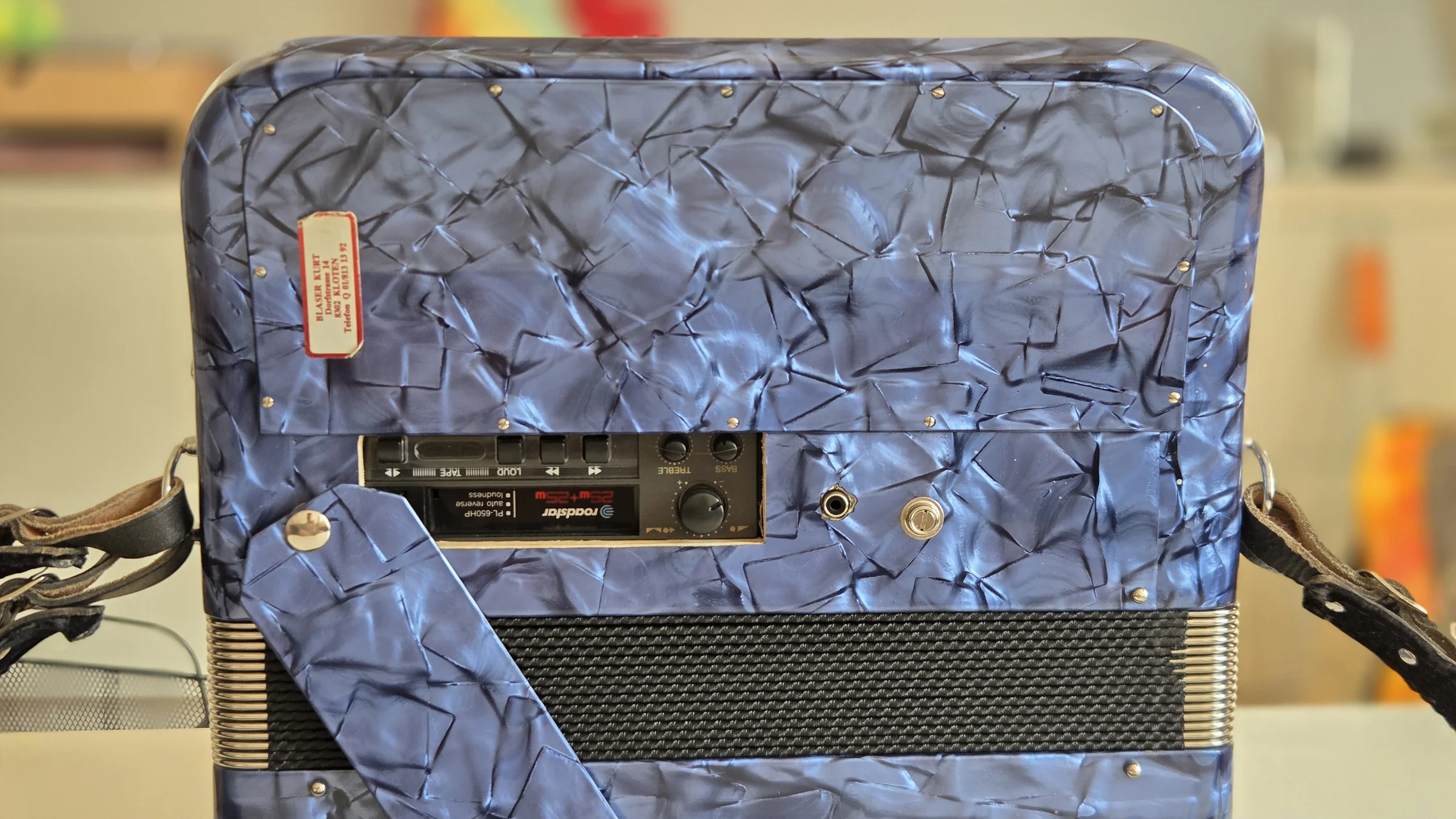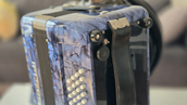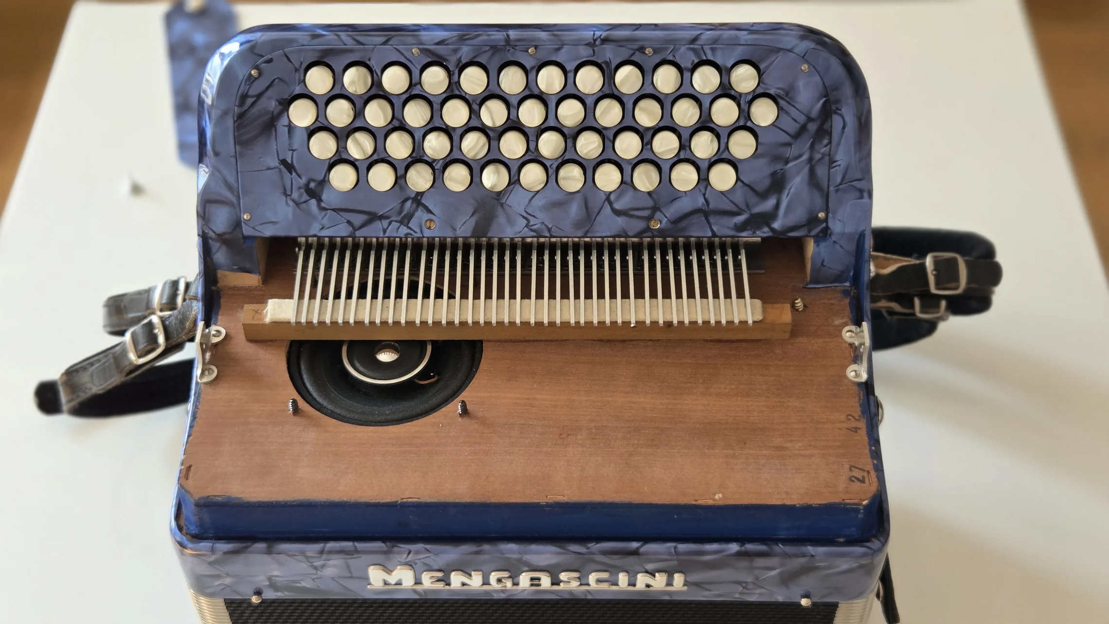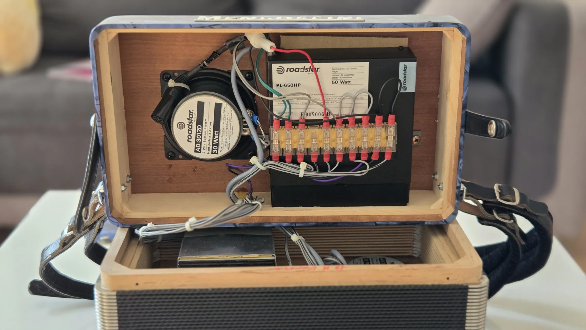 Изначально это была модель Mengascini C30 MD. MD означает melody bass, т.е выборная система слева. Баян очень легкий, 3.5 кг. Но на фабрике он подвергся модернизации. Вместо деки с резонаторами в него установили кассетную магнитору и колонки по 30 ватт. Питалась система от свинцового аккумулятора на 12 вольт. А на левой руке под большим пальцем было выведено колесико громкости.