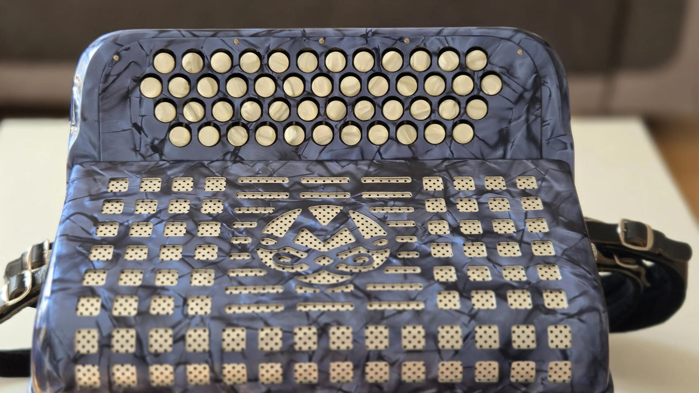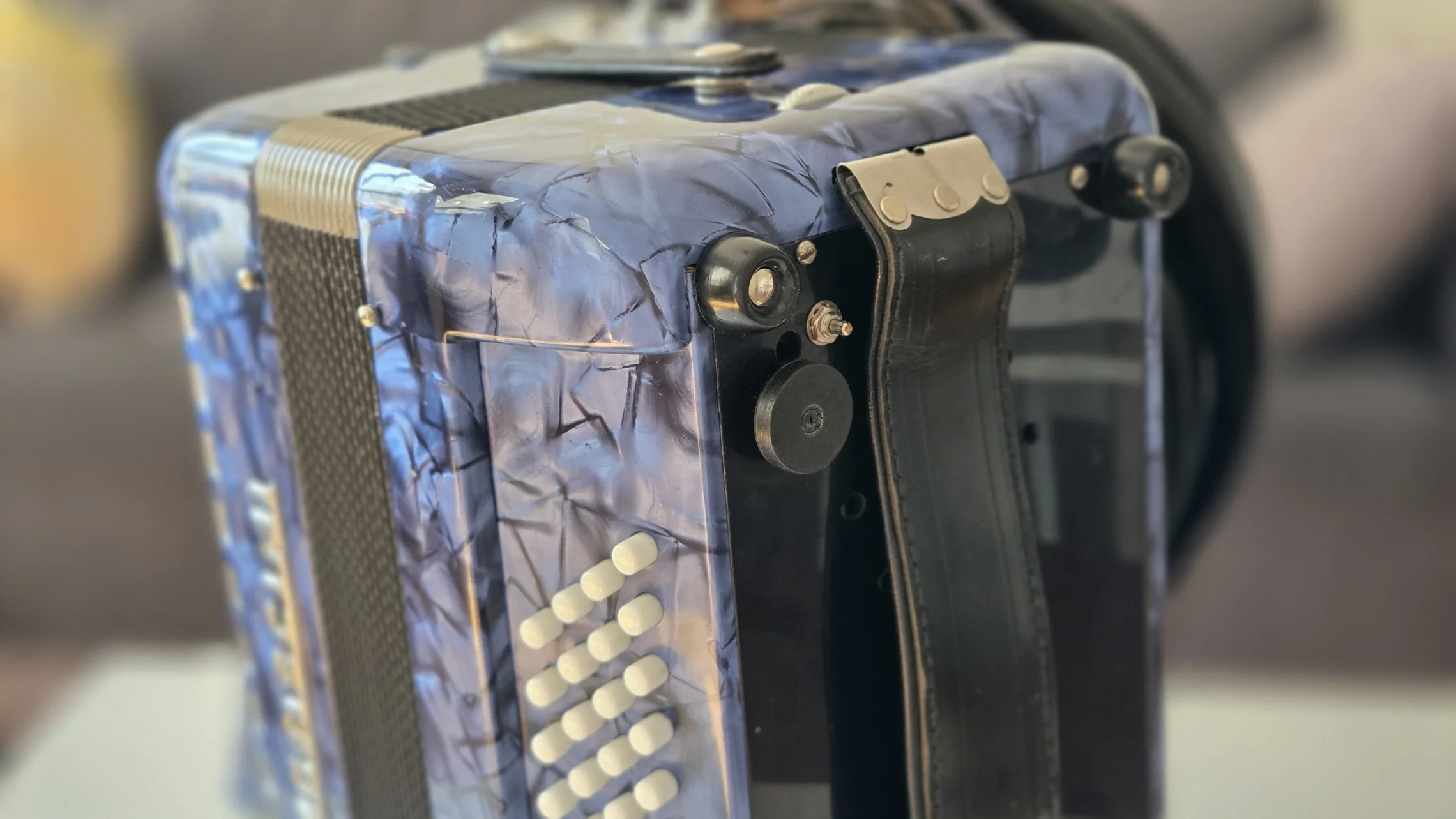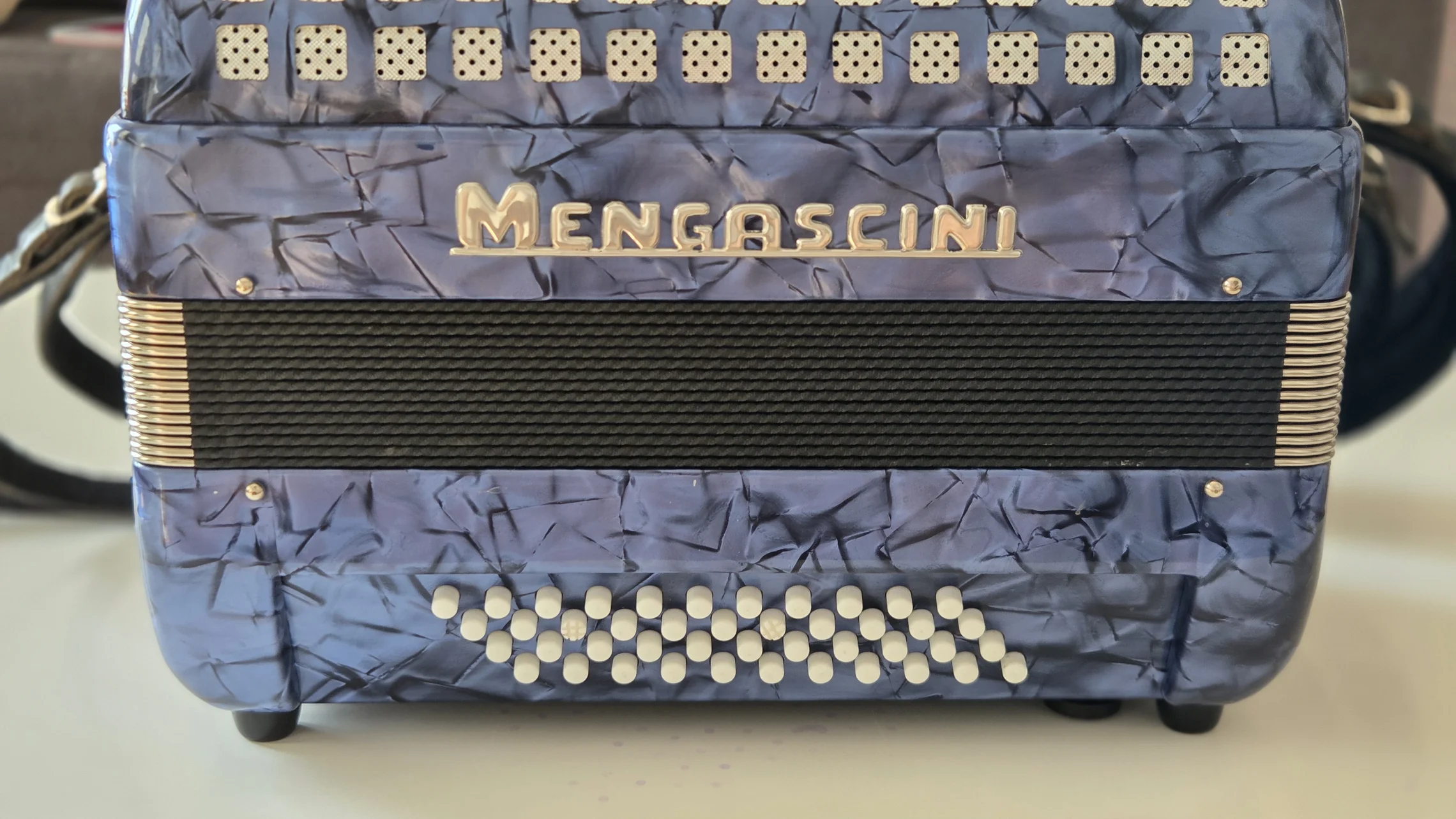 Изначально это была модель Mengascini C30 MD. MD означает melody bass, т.е выборная система слева. Баян очень легкий, 3.5 кг. Но на фабрике он подвергся модернизации. Вместо деки с резонаторами в него установили кассетную магнитору и колонки по 30 ватт. Питалась система от свинцового аккумулятора на 12 вольт. А на левой руке под большим пальцем было выведено колесико громкости.
